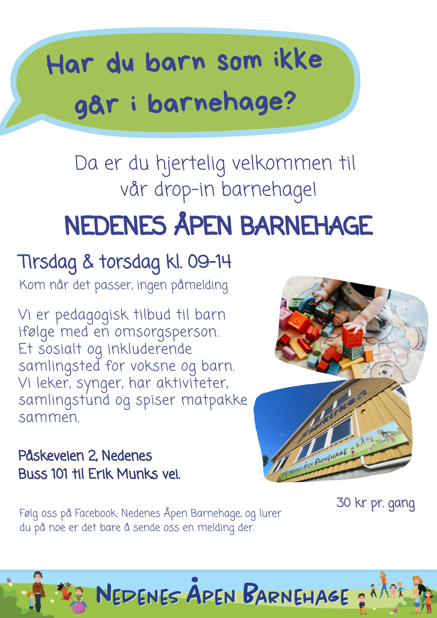 Tirsdager og torsdager fra 09-14 er det åpen barnehage i Norkirken Nedenes.